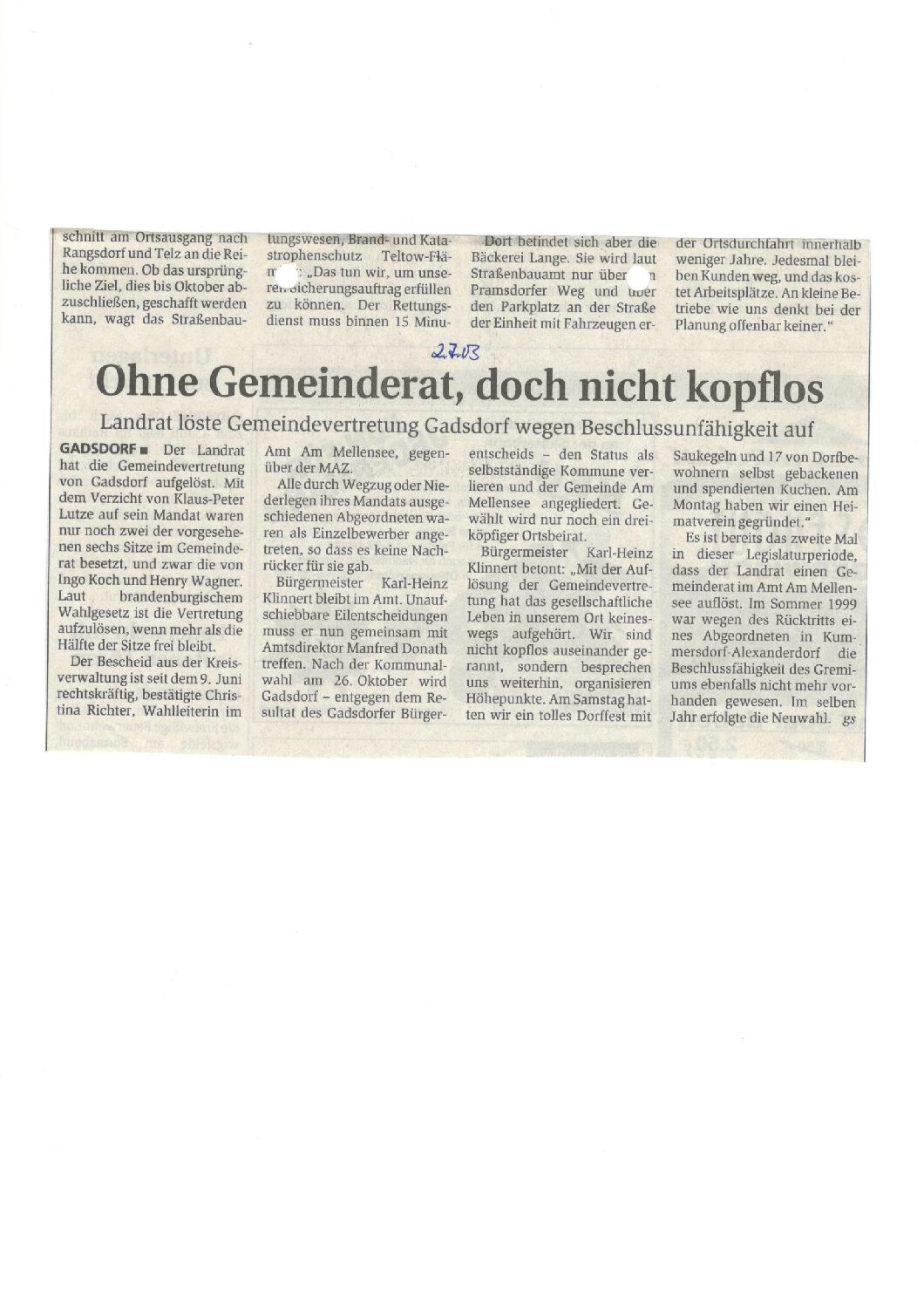 Auflösung der Gemeindevertretung Gadsdorf